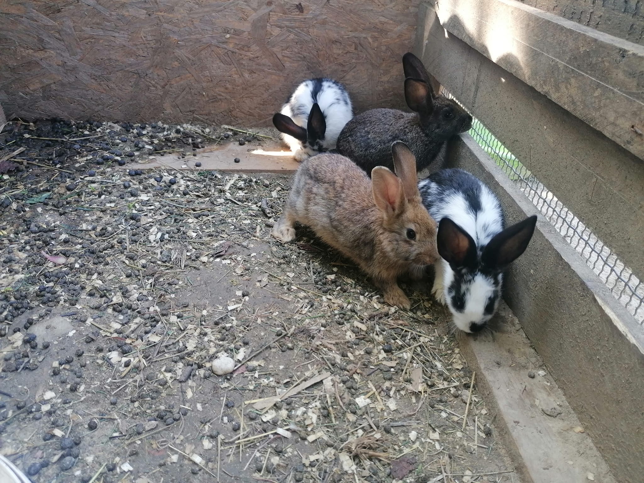 Házi nyuszik és oroszlán fejű törpe nyúl.